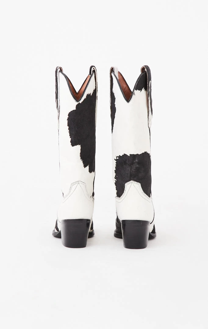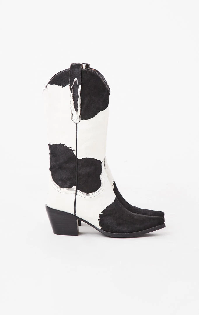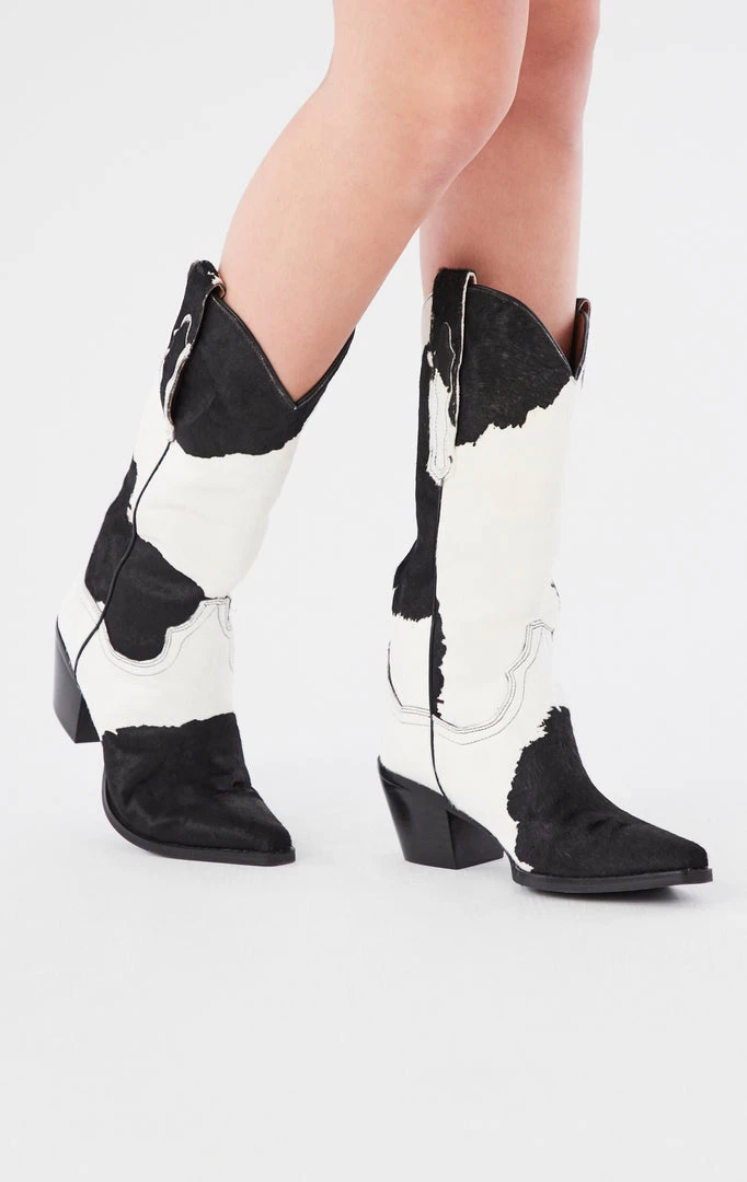 The Dagget Western Mid Calf Cowboy Boot in brown white cow by Jeffrey Campbell. The perfect genuine calf hair cowboy boot with classic western detailing, pointed toe and a block heel.