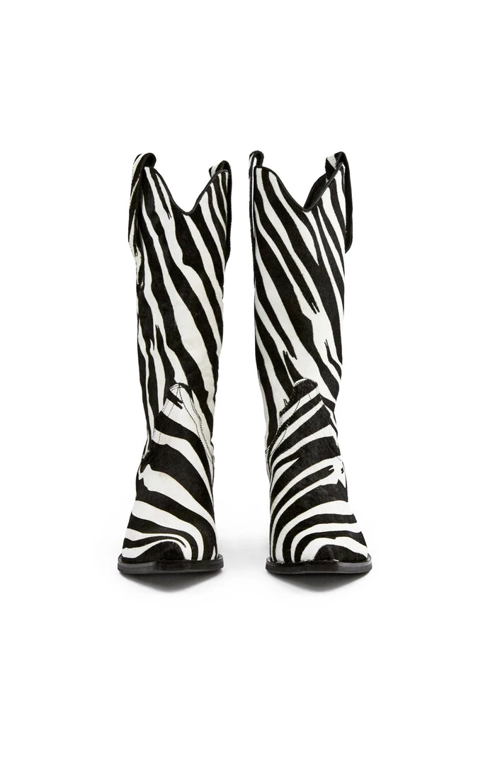 The Dagget Western Mid Calf Cowboy Boot in zebra by Jeffrey Campbell. The perfect genuine calf hair cowboy boot with classic western detailing, pointed toe and a block heel.