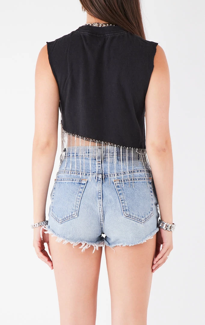 Furst of a Kind sourced this vintage Carolina Panthers tee and gave it an innovative upgrade. Features a stonewash technique, asymmetrical crop hem and rhinestone fringe detailing.Â