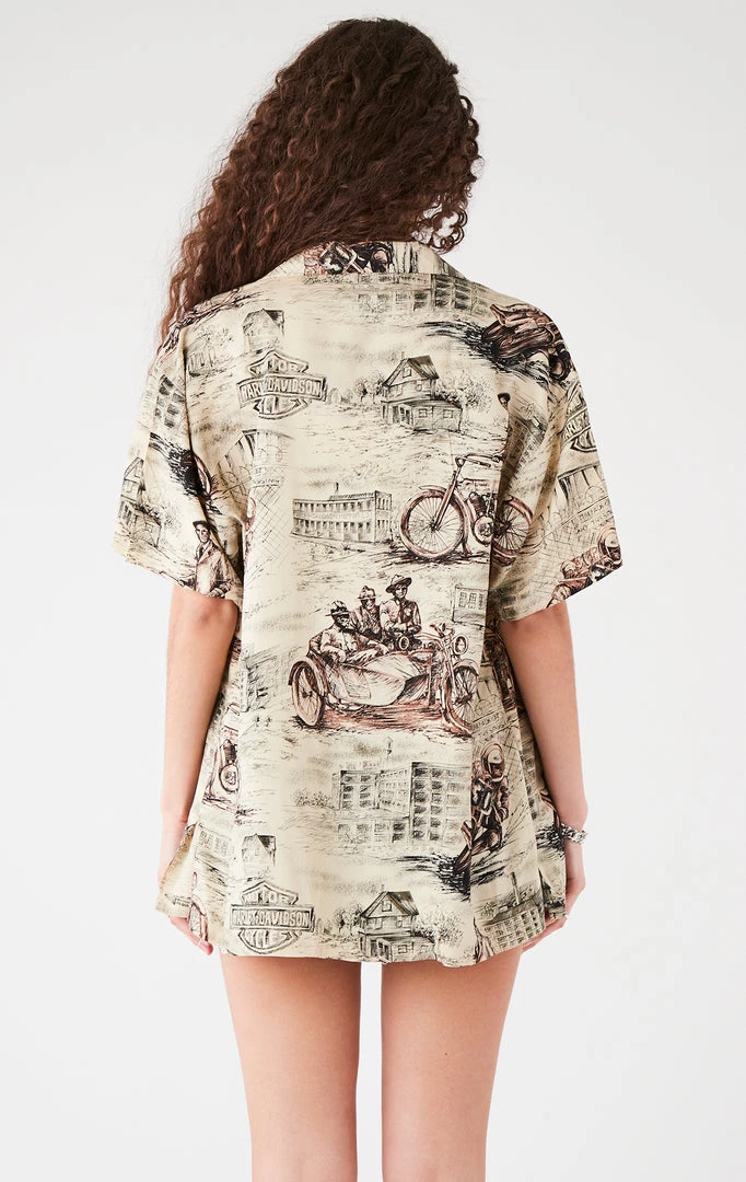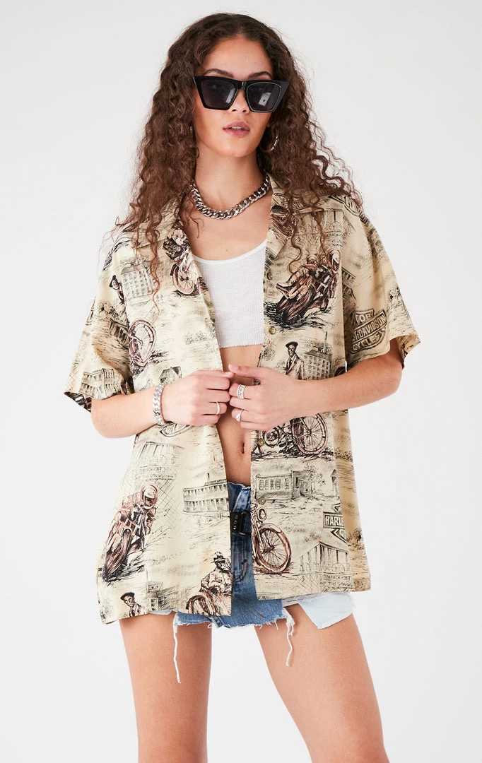 This vintage Harley Davidson Hawaiian top. Furst of a Kind sourced this oversized button down shirt for its perfect pattern and Harley logo detailing. Wear it open, buttoned up, tied at the waist or any way you please.