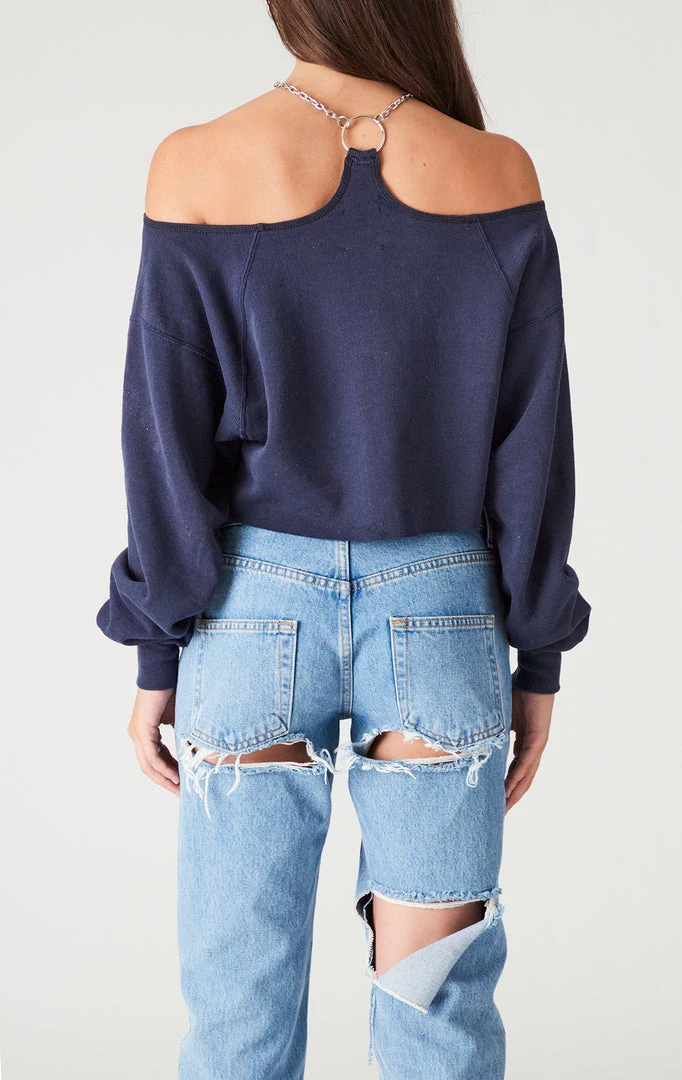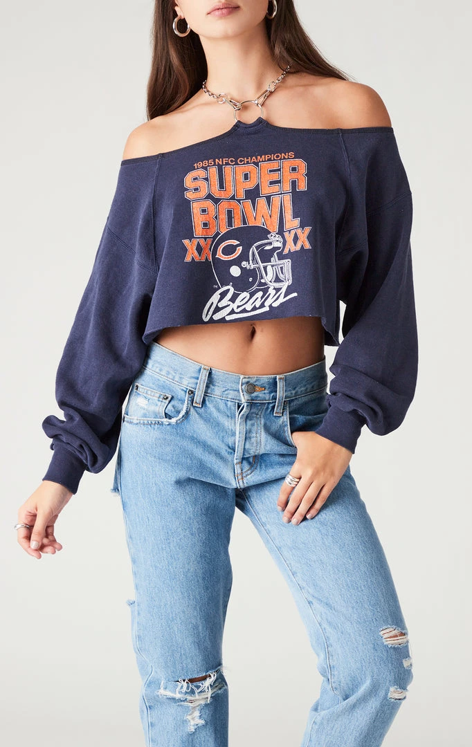 Embrace your inner baddie in this vintage Chicago Bears sweatshirt. Furst of a Kind created a whole new attitude with this reworked style. Featuring shoulder cut outs, cropped length and an insane silver chain detail at the neck. We love vintage NFL sweatshirts no matter what, but this piece will make all your other vintage jealous.