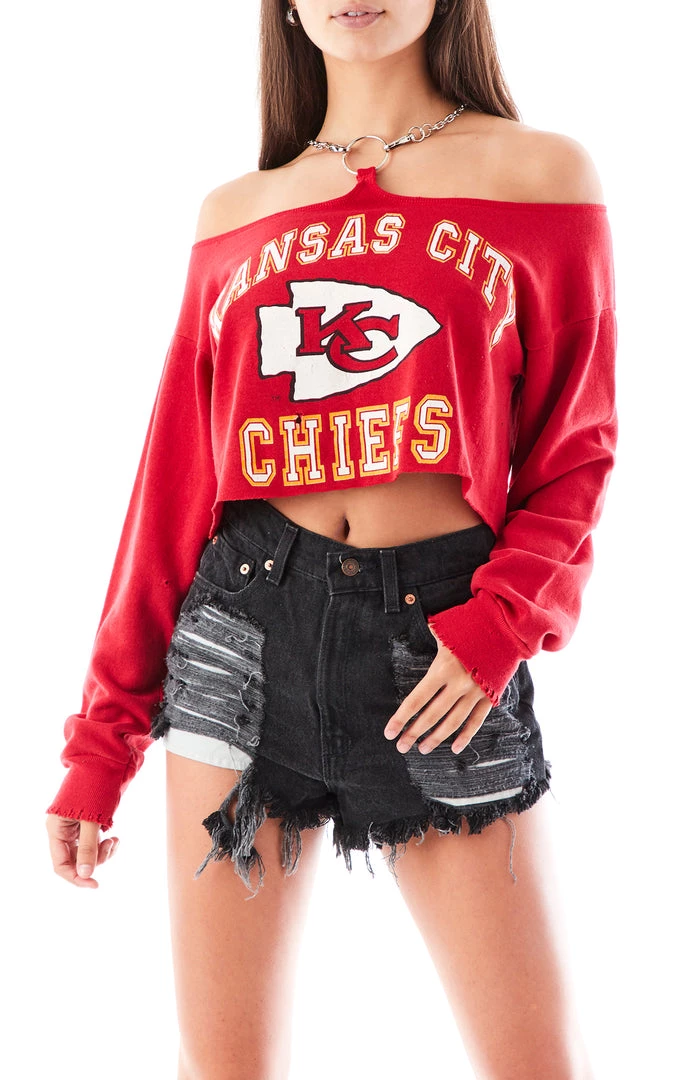 Embrace your inner baddie in this vintageĀ Kansas City ChiefsĀ sweatshirt. Furst of a Kind created a whole new attitude with this reworked style. Featuring shoulder cut outs, cropped length and an insane silver chain detail at the neck.Ā We love vintage NFL sweatshirts no matter what, but this piece will make all your other vintageĀ jealous.Ā