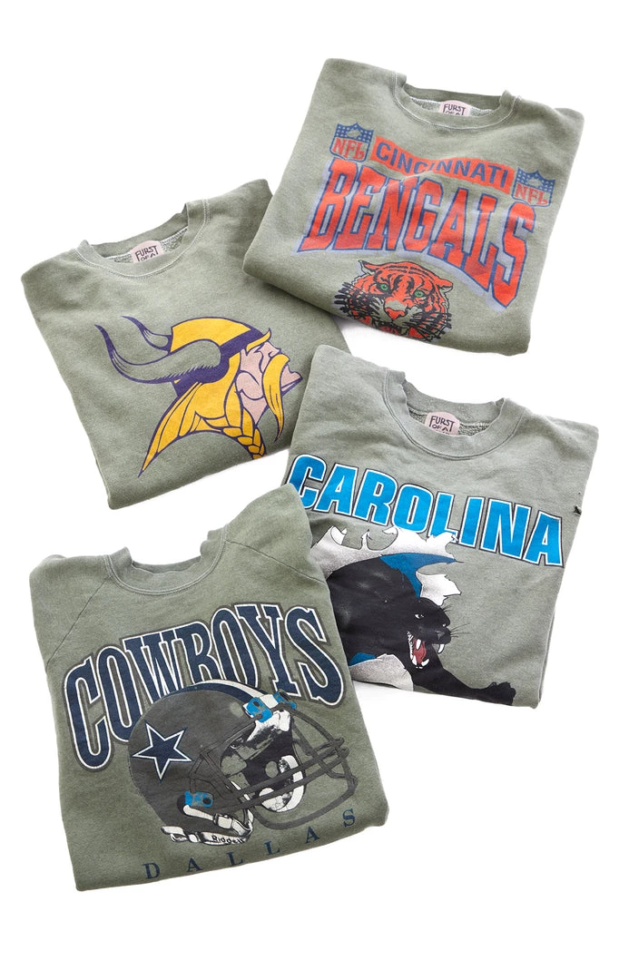 Put your thing down flip it and rework it. Furst of a kind made their mark on this vintage sweatshirt with a fresh green overdye process. Lucky for you, you’re left with a totally unique, repurposed vintage piece that is as sustainable as it is fly. *See sweatshirt details below