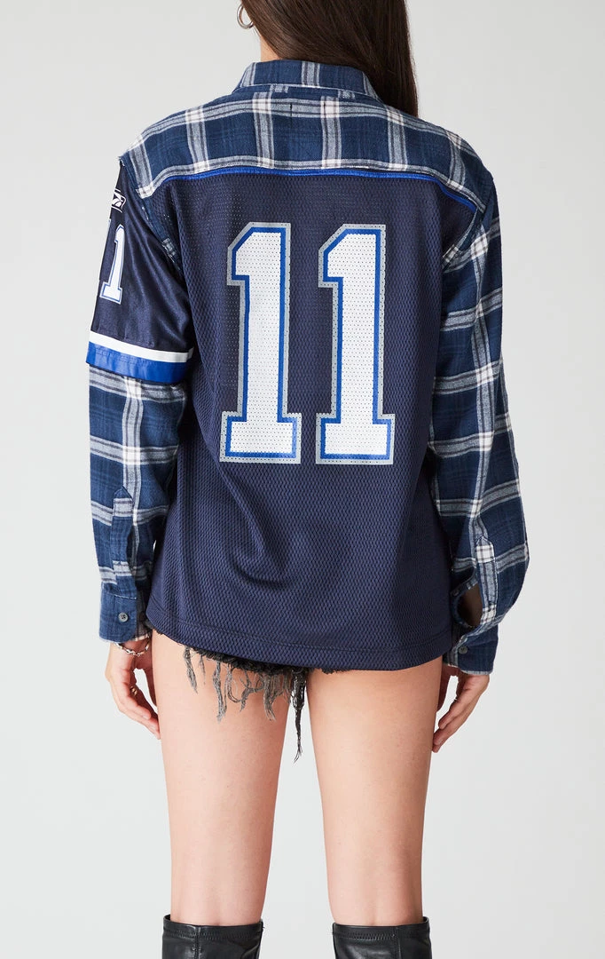 Hate to see you go, but love to watch you leave. It’s all about the back detail on this one of a kind vintage flannel. Furst of a Kind added a vintage Buffalo Bills jersey insert across the back and layered it over the sleeve of this plaid top. We are officially obsessed.
