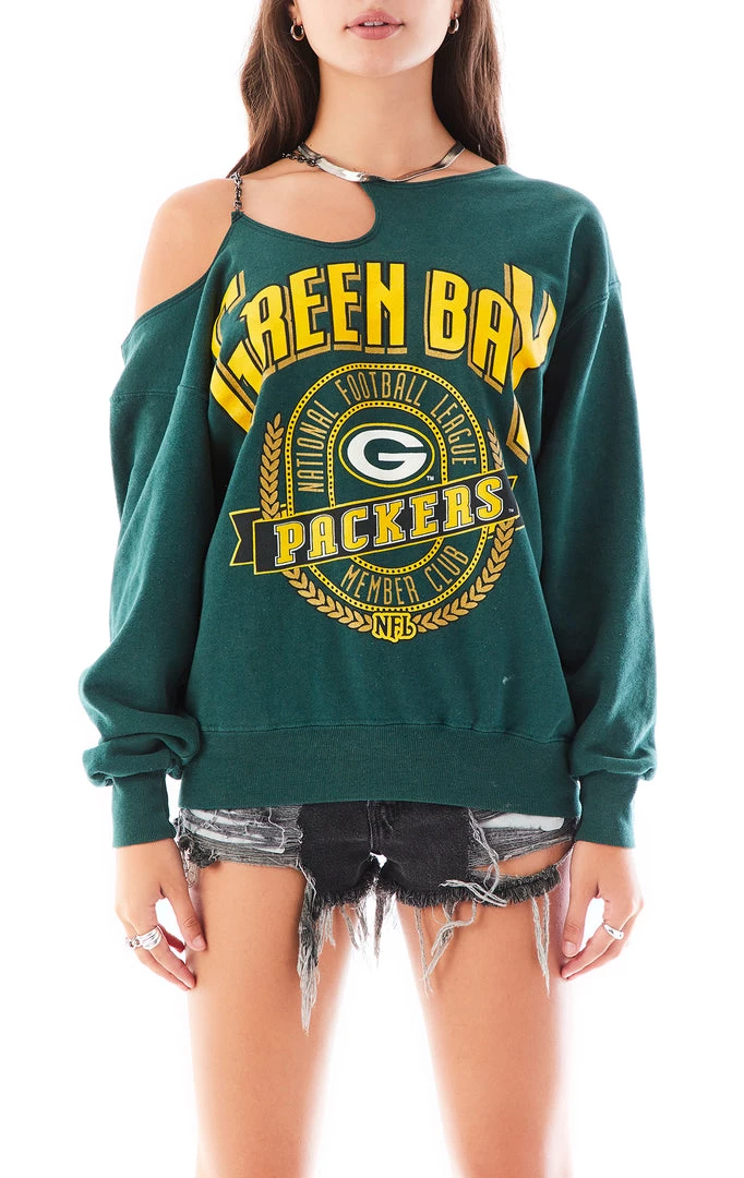 Cozy, but cute? Say less. This one of a kind vintage Green Bay Packers sweatshirt is raising the bar for reworked vintage. Featuring a peek-a-boo cut out shoulder moment with double chain detailing, Furst of a Kind has out done themselves yet again this season. You thought the tank version sold out fast? You better add to cart like, yesterday.