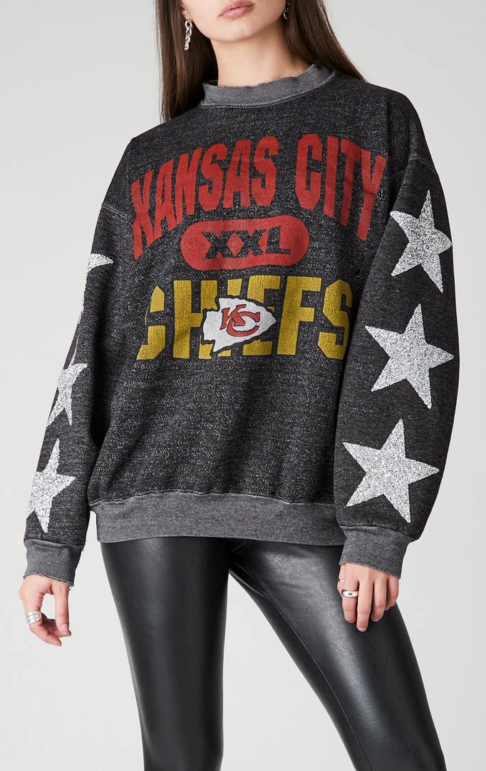 Put your thing down flip it and rework it. Furst of a kind made their mark on this vintageĀ Kansas City Chiefs sweatshirt with a fresh black overdye process. How could we be even more obsessed? Add silverĀ rhinestone star patches to the sleeves, that’s how.