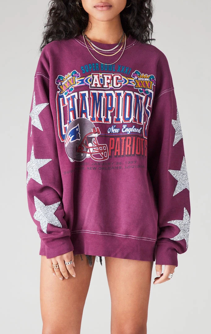 Put your thing down flip it and rework it. Furst of a kind made their mark on this vintage New England Patriots sweatshirt with a fresh purple overdye process. How could we be even more obsessed? Add silver rhinestone star patches to the sleeves, that’s how. Done and done.