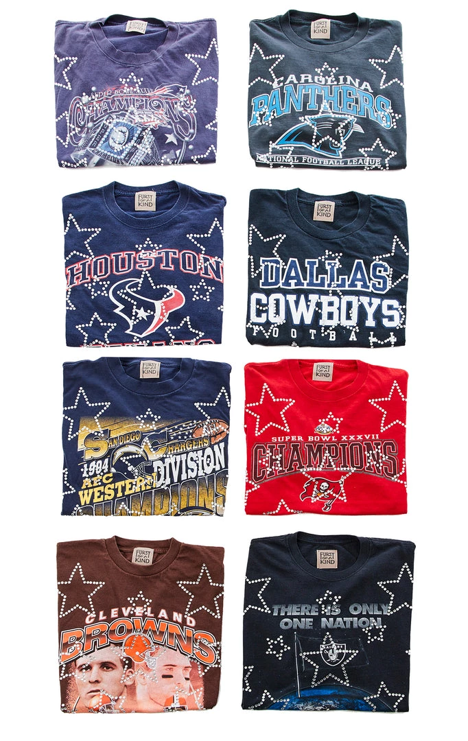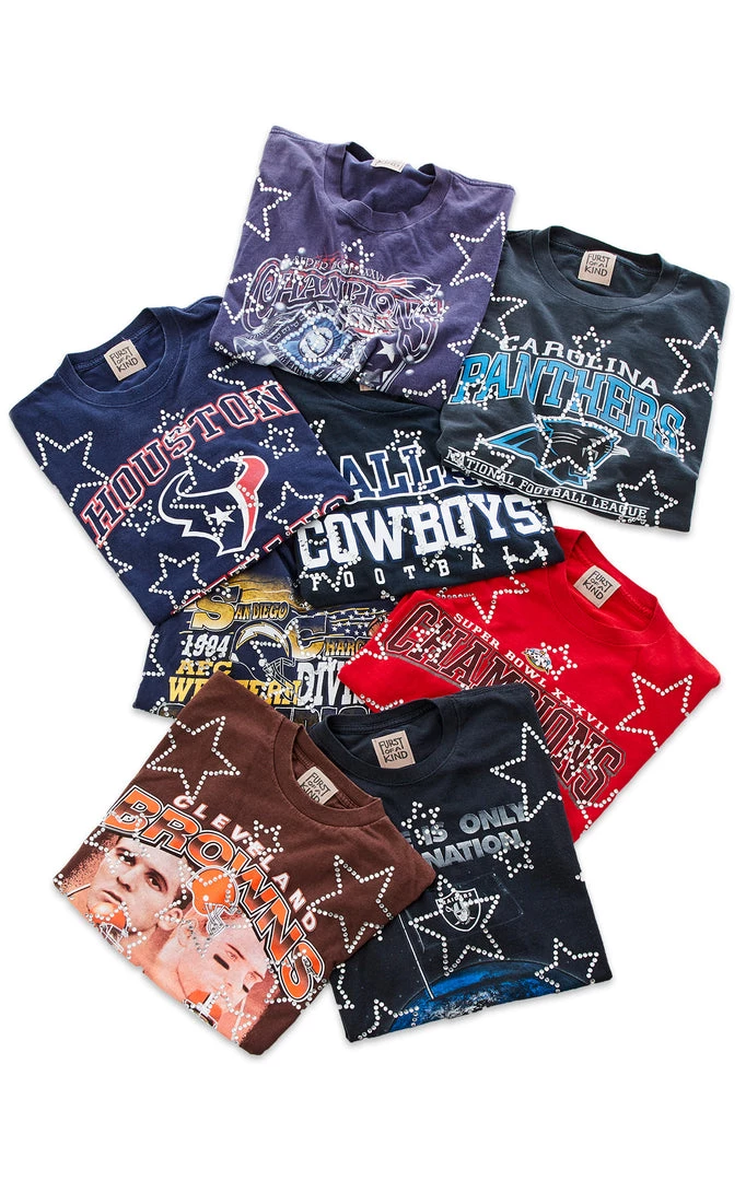 Bling on the stars. This vintage Minnesota Vikings rhinestone star outline tee was reworked and embellished just for you by Furst of a Kind. The front of this vintage NFL tee is scattered with rhinestones in a star outline pattern that is totally out of this world. Bling it on. *See t-shirt details below