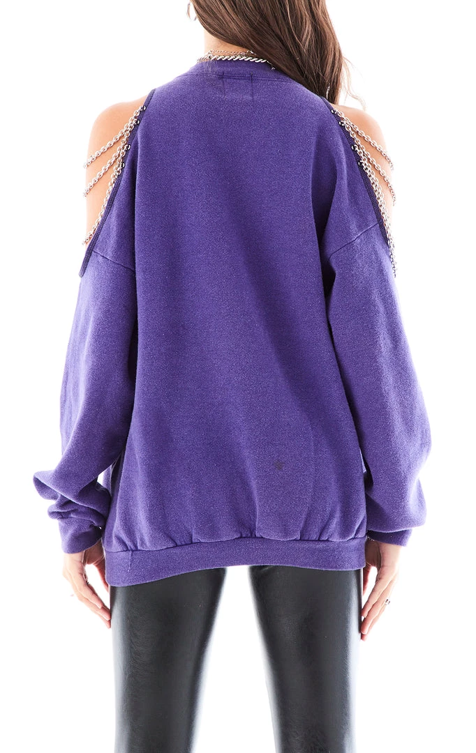 Give the other team the cold shoulder in this reworked vintage Minnesota Vikings sweatshirt. Featuring cut out shoulder detailing that is draped and dripping in silver chains. Trust us, this Furst of a Kind piece is a major crowd pleaser. It’s one of a kind sustainability with an attitude, and we’re here for it.