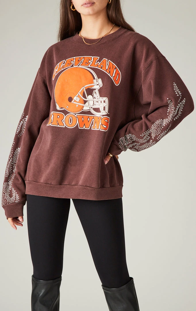 This vintage Cleveland Browns sweatshirt is almost too hot to handle. Furst of a Kind reworked this NFL sweatshirt with silver rhinestone flame embellishment on both sleeves. The sickest sustainable addition to your vintage collection.Â