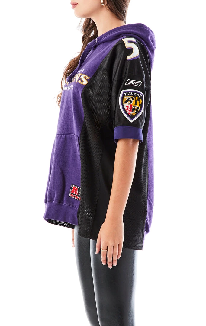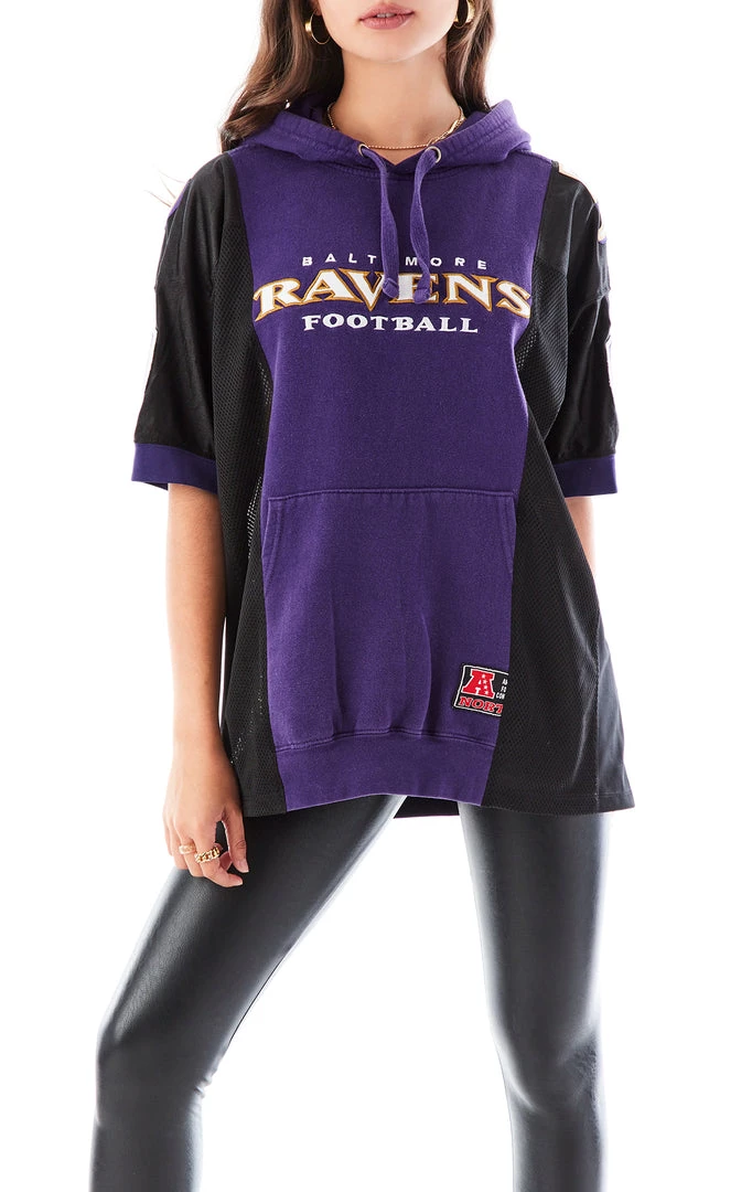 You don’t have to be a super fan to serve sporty style. Furst of a Kind is known for their innovative reworked vintage, and this style definitely adds to their street-cred. This piece features a vintage Baltimore Ravens hooded sweatshirt spliced vertically with contrasting vintage jersey sleeves. Hand sourced and perfectly matched, this is basically a no-brainer.