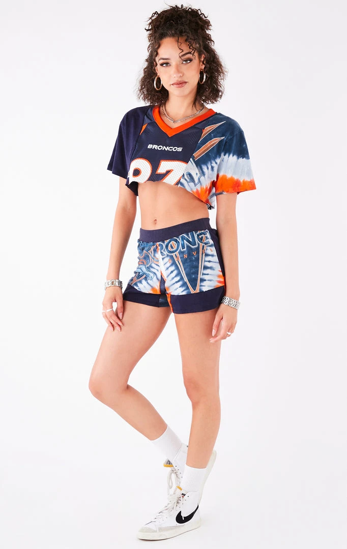 This one-of-a-kind set was reworked by Furst of a Kind from a vintageĀ Denver BroncosĀ jersey, tee and tie dye tee. These pieces were spliced together into a set featuring a cropĀ top and shorts.Ā