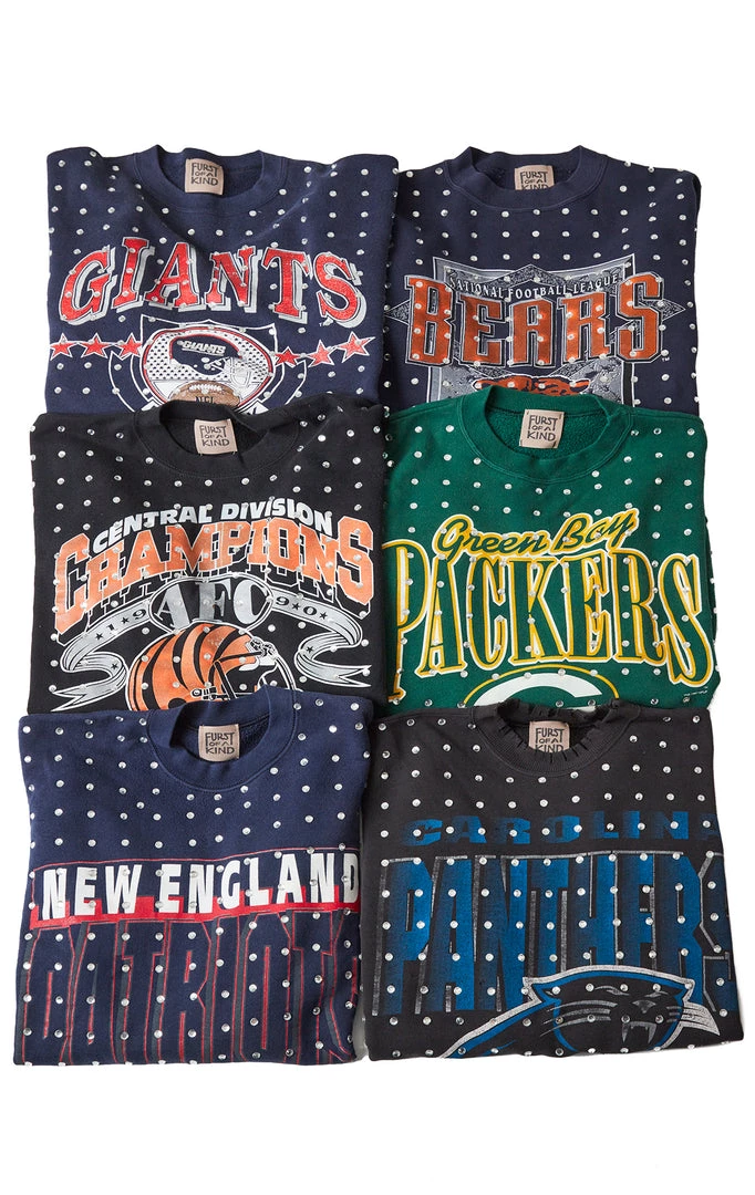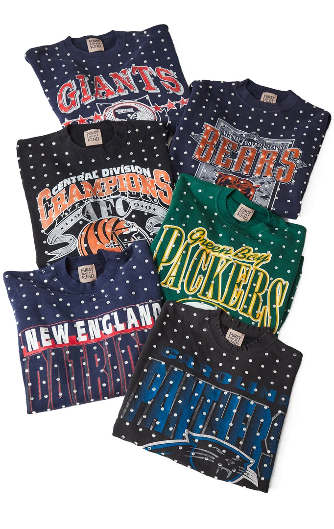 This one of a kind vintage sweatshirt boasts some serious sparkle. The Furst of a Kind team embellished this piece by hand. It features an allover rhinestone embellishment scattered across the bodice and sleeves. *See sweatshirt details below