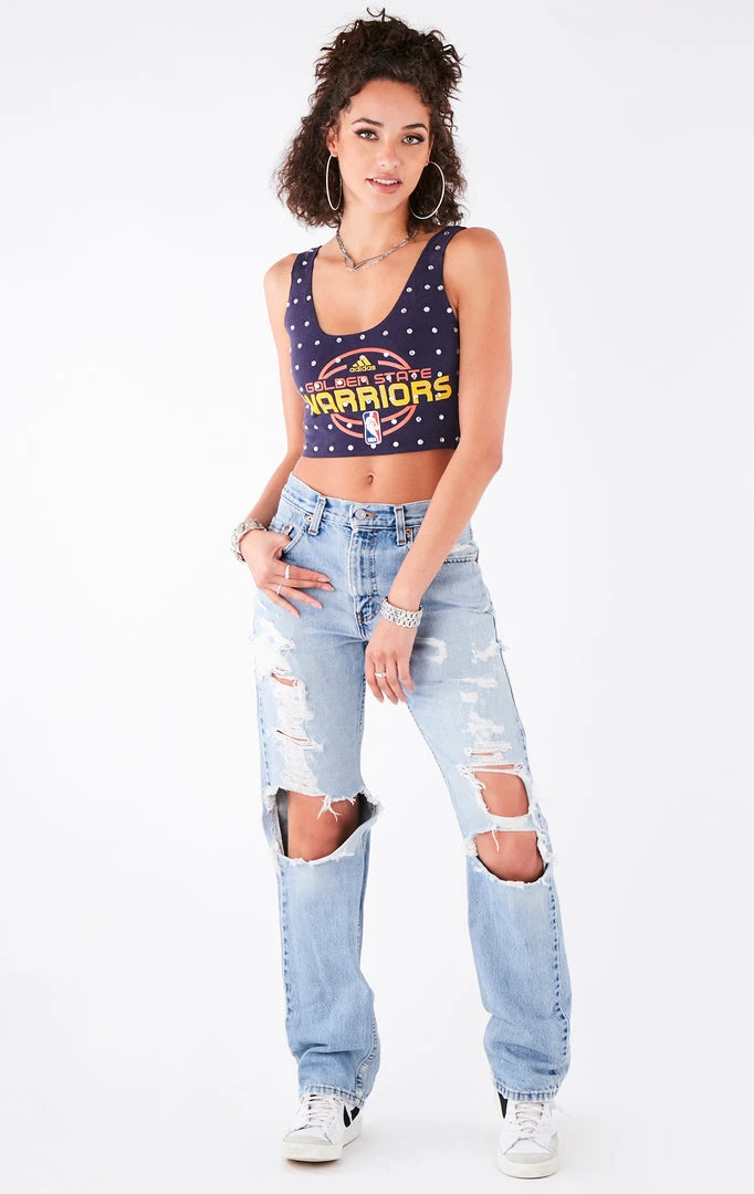 Furst of a Kind reworked this vintage Golden State Warriors tee into a cropped tank. Features allover rhinestone detailing on the front and back.