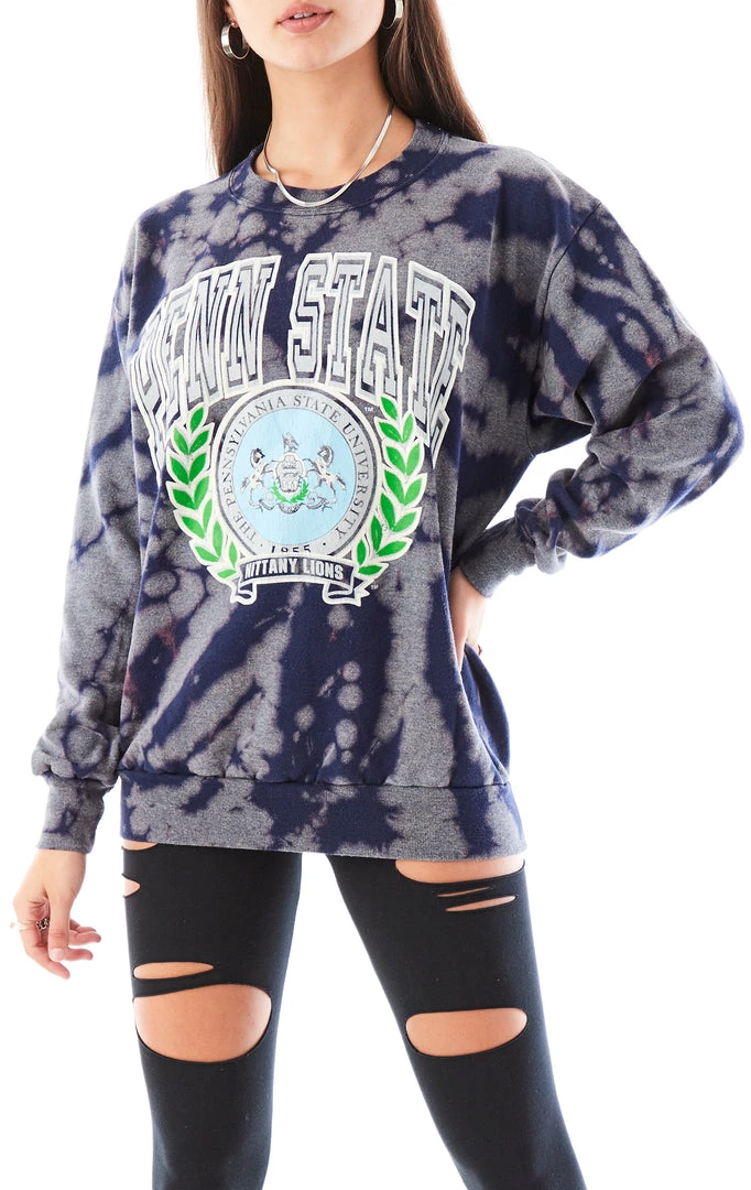 This vintage Penn State University sweatshirt is serving all the looks, thanks to the unique bleach spiral pattern made for you by Furst of a Kind. This sweatshirt features a classic crewneck and relaxed fit.