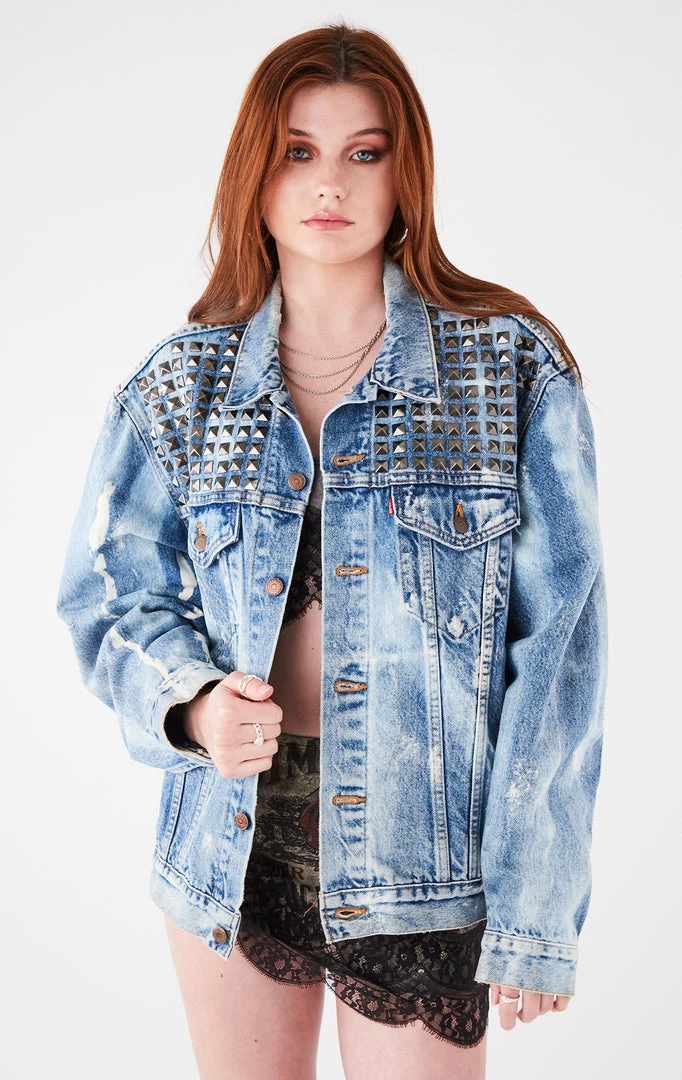 One-of-a-kind vintage Levi’s denim jacket. This Levi’s vintage denim jacket was reworked by hand in Los Angeles by Furst of a Kind with a bleach treatment and studding.