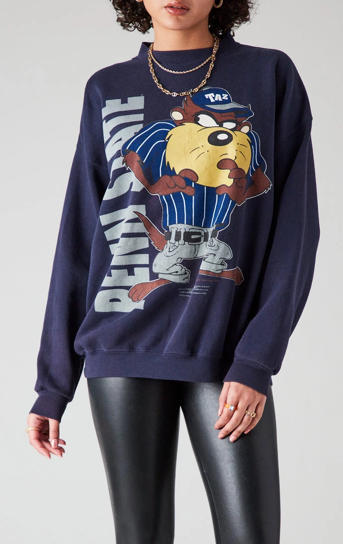 Cartoons & College? Sounds like our kind of Sunday Morning. Cozy up in this vintage Tazmanian Devil Penn State University sweatshirt. Furst of a Kind stonewashed this vintage crewneck to ensure an ultra worn-in look and feel. So the cozier that Sunday snuggle session, the better.