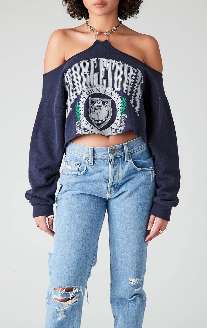 Embrace your inner baddie in this vintage Georgetown University sweatshirt. Furst of a Kind created a whole new attitude with this reworked style. Featuring shoulder cut outs, cropped length and an insane silver chain detail at the neck. We love vintage college sweatshirts no matter what, but this piece will make all your other vintage jealous.