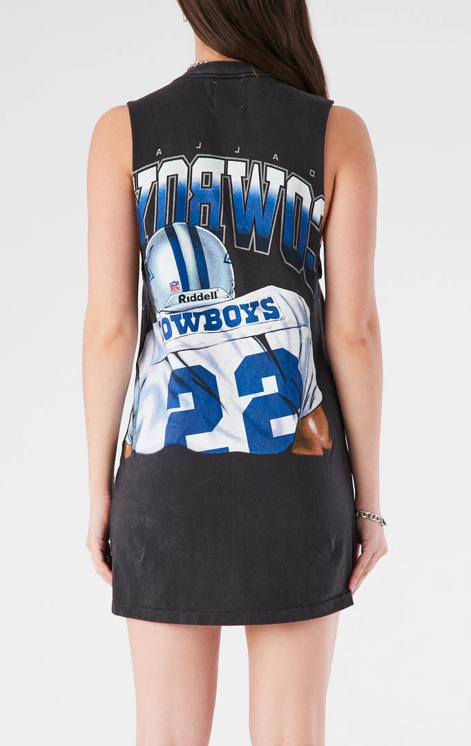 Furst of a Kind took an oversized vintage Dallas Cowboys tee and reworked it into a dress. This one-of-a-kind dress features chain trim down the front.