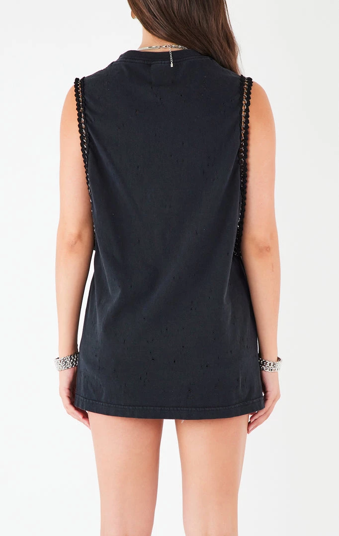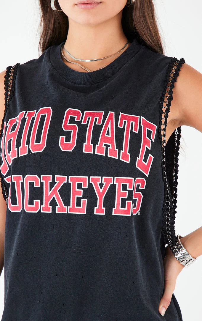 This vintage Ohio State University tee was sourced and reworked by Furst of a Kind in Los Angeles with a dramatic sleeveless cut and lined with chain trim.