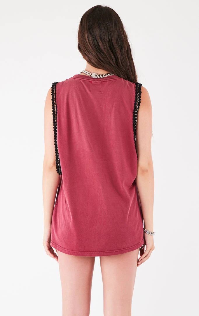 This vintage Virginia Tech tee was sourced and reworked by Furst of a Kind in Los Angeles with a dramatic sleeveless cut and lined with chain trim.