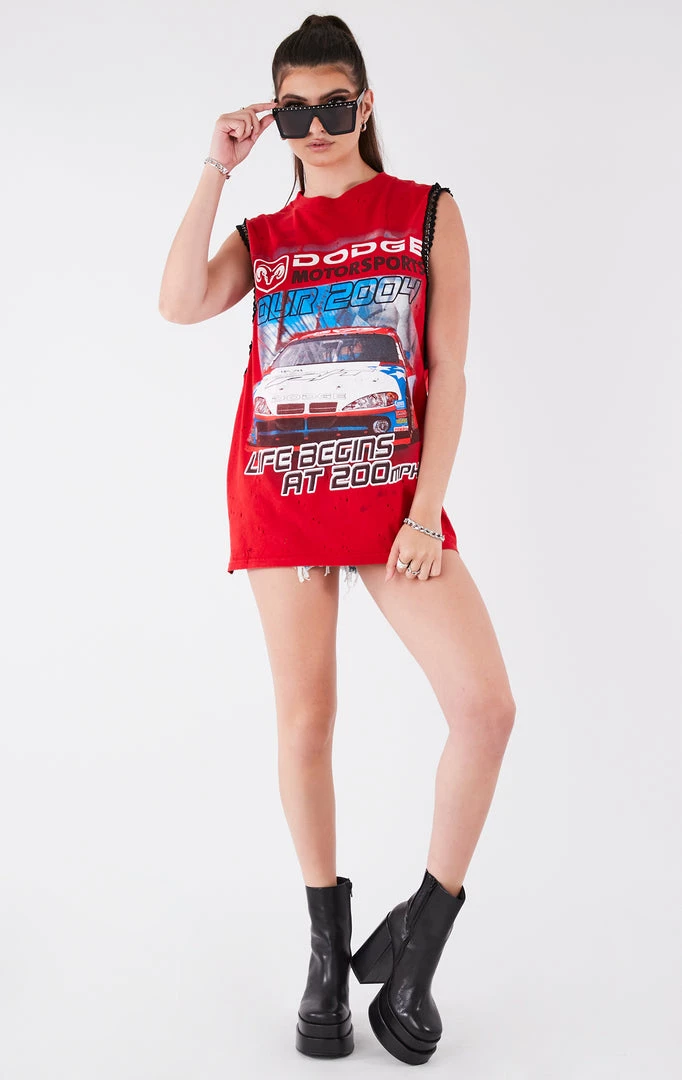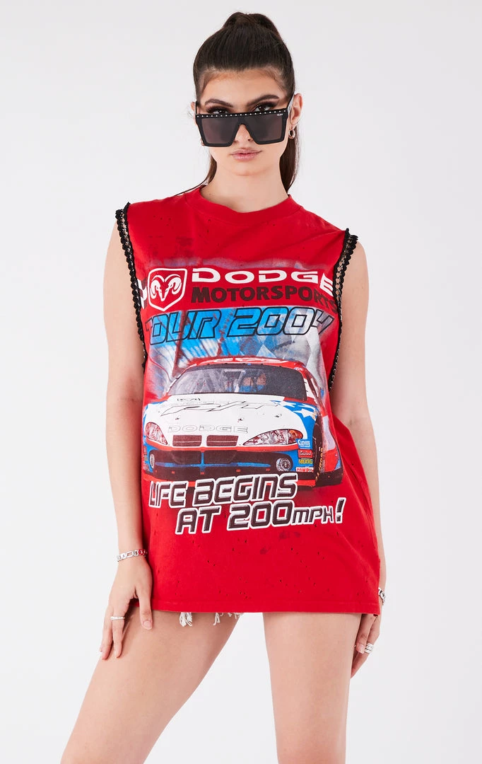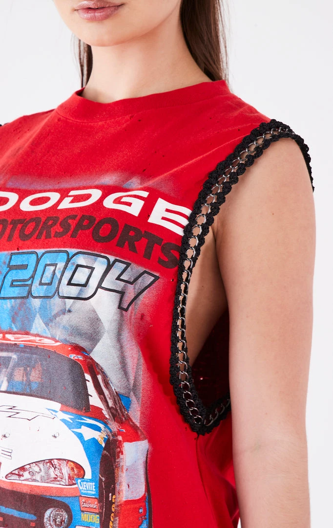 This vintage Nascar tee was sourced and reworked by Furst of a Kind in Los Angeles with a dramatic sleeveless cut and lined with chain trim.