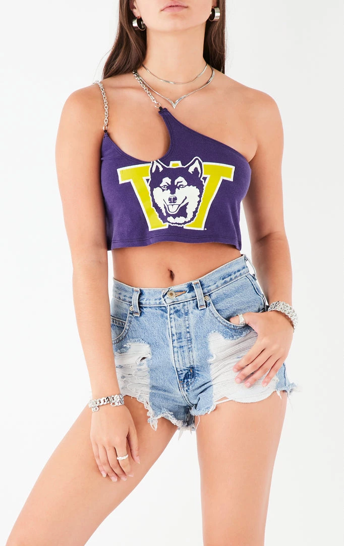 Furst of a Kind took this vintage University of Washington tee and reworked it into a one shoulder tank top. This tank is complete with a one-shoulder cut out, cropped hem and double chain straps.