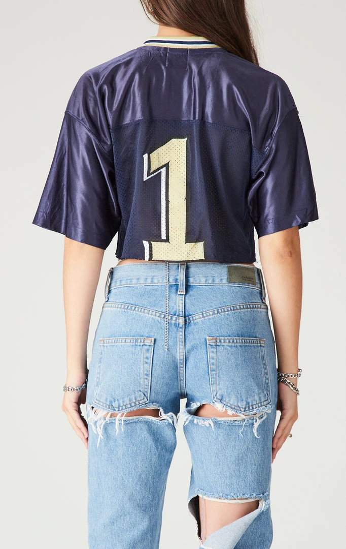 This one of a kind reworked University of Pittsburgh jersey is causing a commotion. Sorry, not sorry. The graphic, the super soft vintage jersey, the perfect cropped length…but let’s face it: it’s the silver chain lace up detailing for us. On the sidelines or street style, you know Furst of a Kind never disappoints.