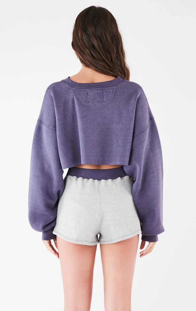 This one-of-a-kind set was reworked by Furst of a Kind from a vintage Duke University sweatshirt. Redesigned into a two piece set featuring a cropped sweatshirt paired with a spliced sweatshirt short.