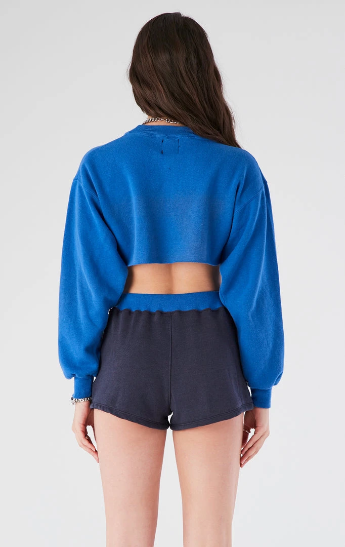 This one-of-a-kind set was reworked by Furst of a Kind from a vintage University of Kansas sweatshirt. Redesigned into a two piece set featuring a cropped sweatshirt paired with a spliced sweatshirt short.Â