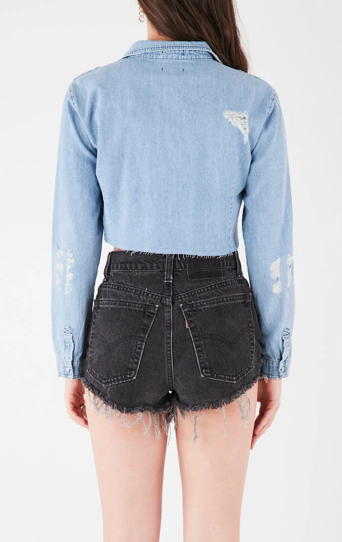 Furst of a Kind reworked this repurposed chambray. They added a vintage Syracuse University tee on the front panel to make this a one-of-a-kind fit. Complete with hand shredding, a cropped cut and snap closure.