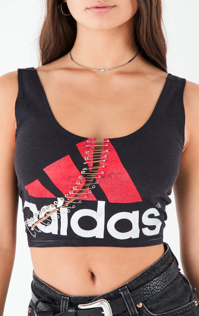 Furst of a Kind reworked this vintage Adidas tee. Features a tank top shape, cropped cut and curved ladder cut out with safety pin detail.