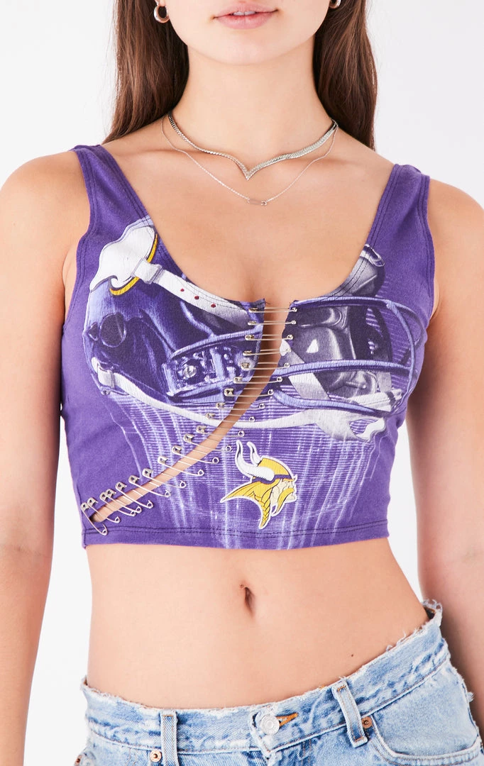 Furst of a Kind reworked this vintageĀ Minnestoa VikingsĀ tee. Features a tank top shape, cropped cut and curved ladder cut out with safety pin detail.Ā