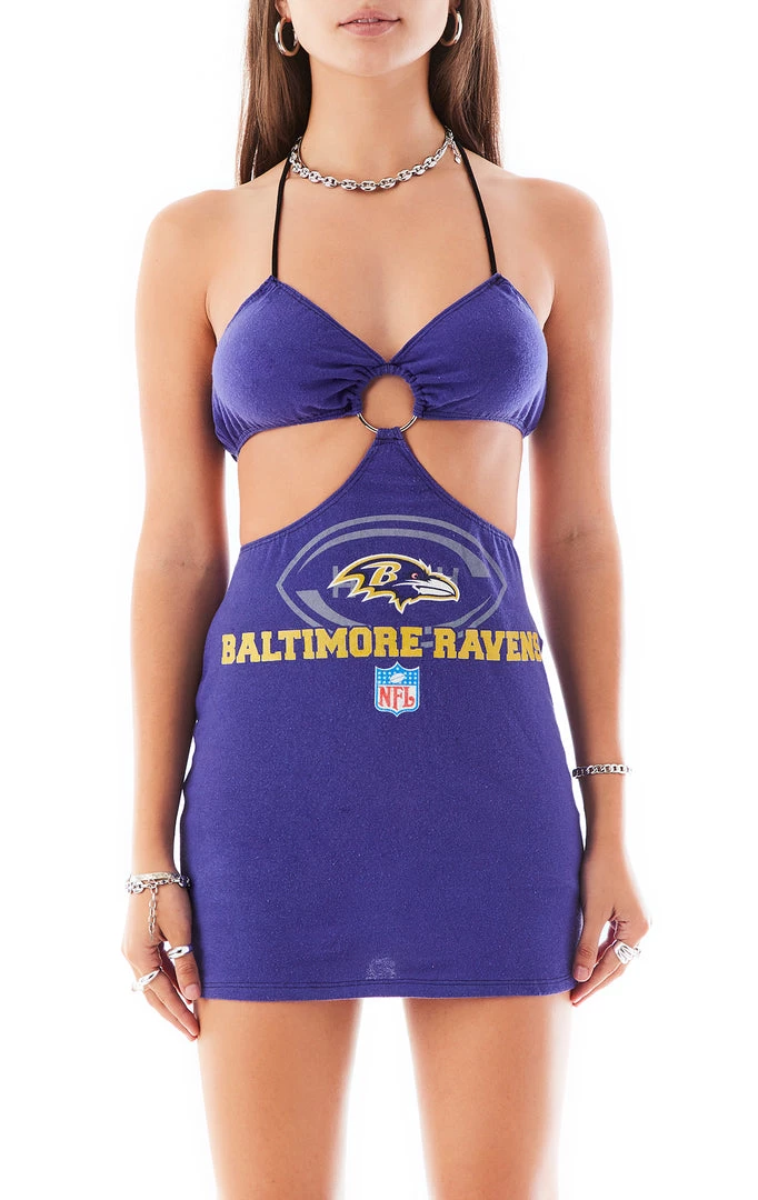 On the hunt for a totally bold, iconic lewk? You know you’ve come to the right place. This vintage Baltimore Ravens halter dress literally screams LF Stores. Furst of a Kind took an oversized vintage tee and reinvented its whole purpose, reworking it into the ultimate head-turning fit with fresh double side cut outs and a halter neck. There’s no comparing this dress, your other vintage could NEVER.