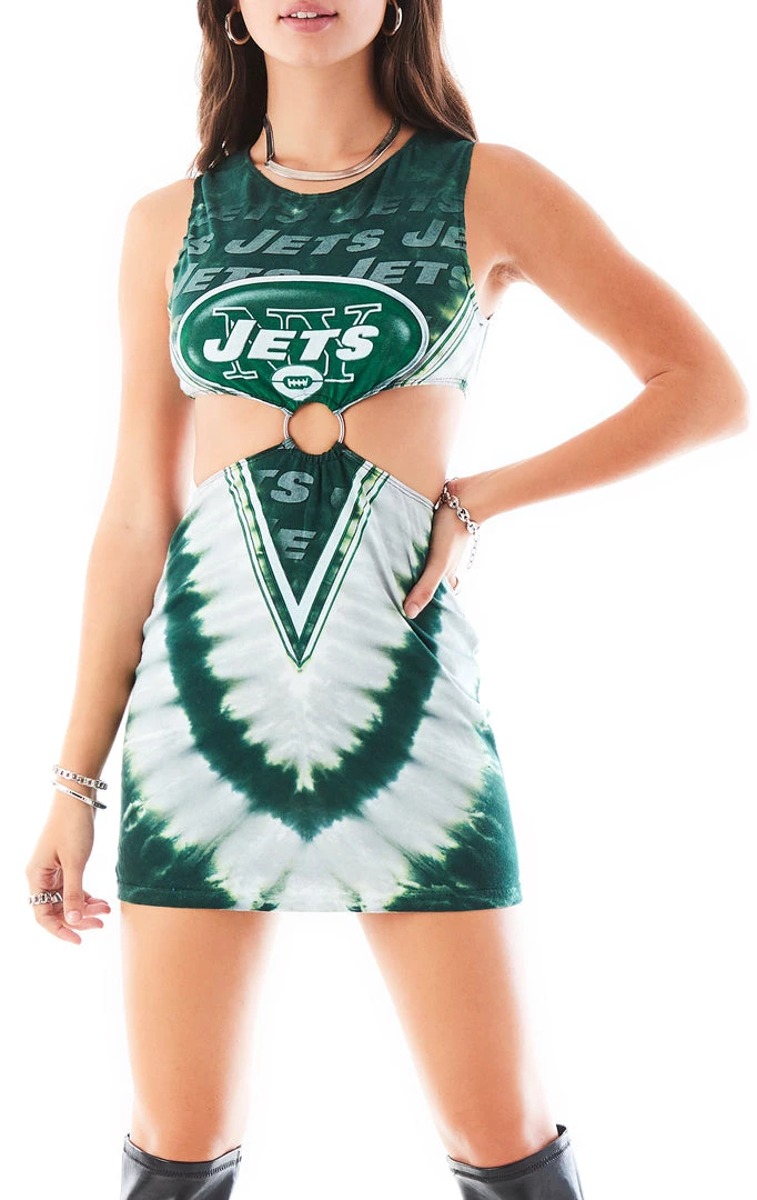 Furst of a Kind put the WERK into reworked vintage once again with this killer vintage New york Jets dress. Let’s talk fit: We’ve got a sleeveless cut, high neckline, peek-a-boo cut out center, and a metal O-ring detail that elevates this style to a whole new dimension.