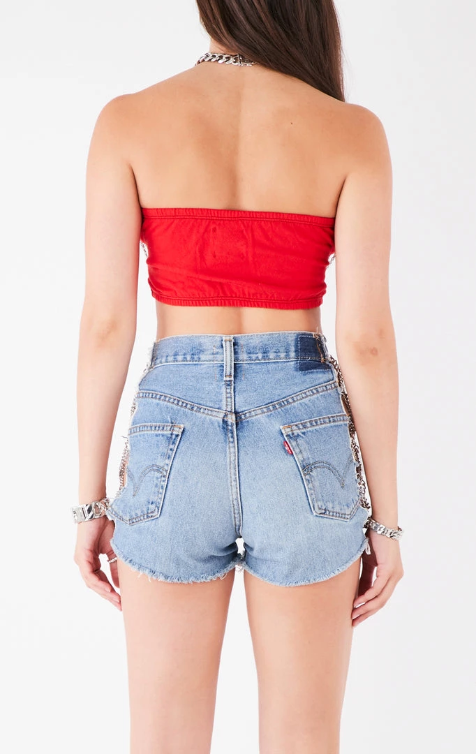 This vintage Ohio State University tee was reworked into a tube top. Features a flattering cut out, cropped length, double o-rings and finished off with waterfall chain detailing.