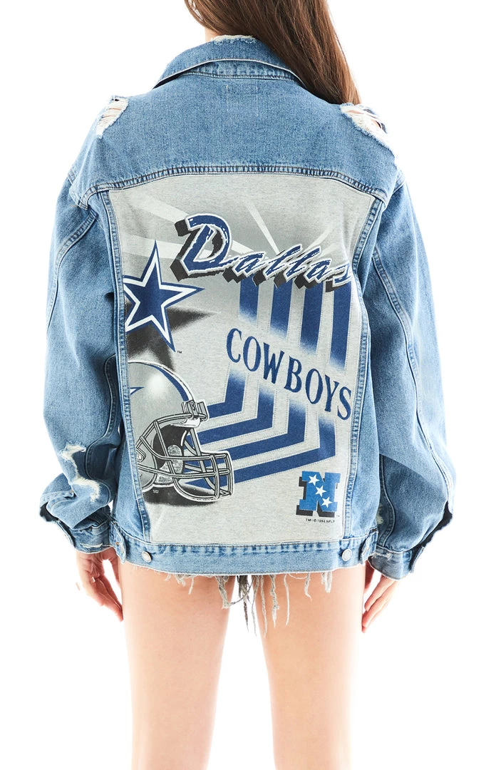 It’s all about the back detail on this one-of-a-kind repurposed blue denim jacket. Furst of a Kind reworked this denim jacket with a vintage Dallas Cowboys graphic insert on the back.