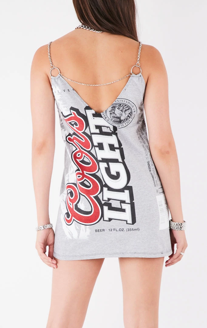 This one-of-a-kind vintage Coors Light tee was handpicked in the USA and reworked into a tank dress. Furst of a Kind redesigned this piece by hand in Los Angeles with chain straps and draped chain detailing.