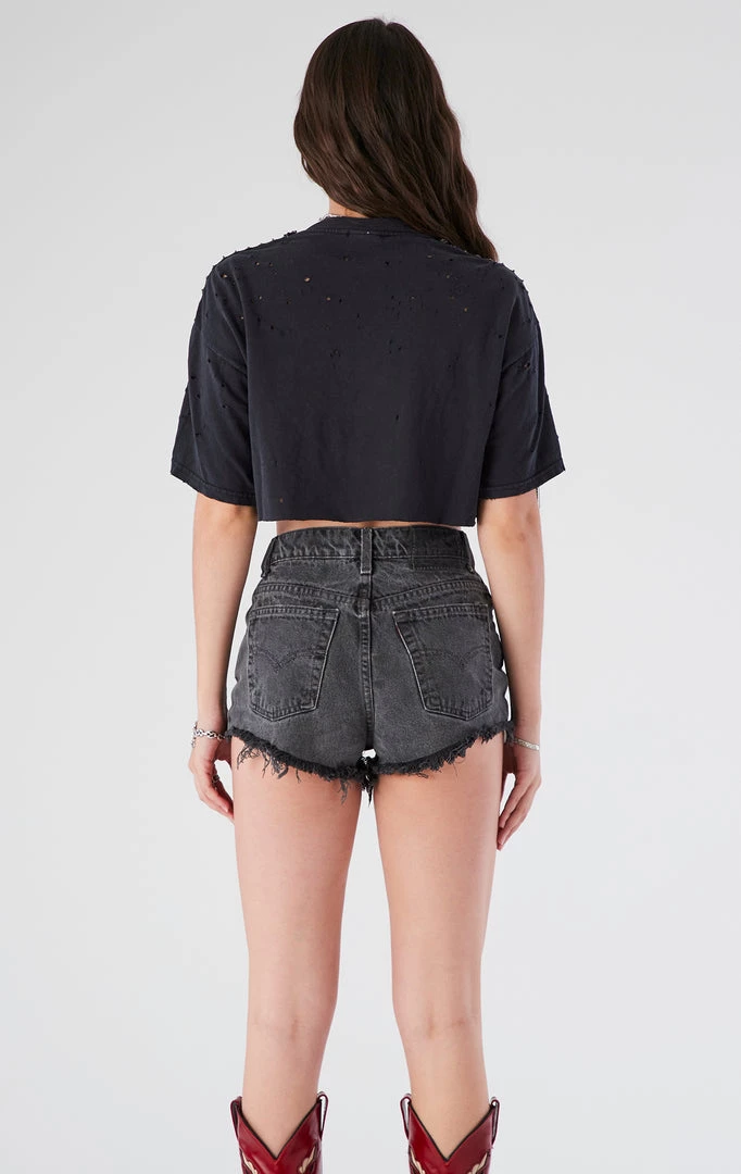 This one-a-kind vintage Jack Daniels tee was reworked by Furst of a Kind. Upcycled with a stonewash technique, cropped cut and rhinestone fringe on the sleeves.