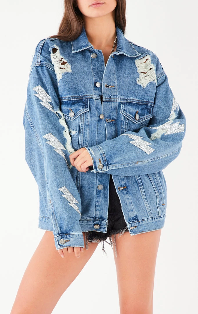 We are obsessed with the back detail on this one of a kind repurposed blue denim jacket. Furst of a Kind added a vintage Tampa Bay Lightning graphic on the back of this jacket and silver lightning bolts to the sleeves.Â