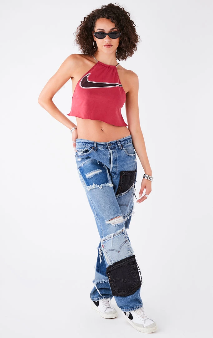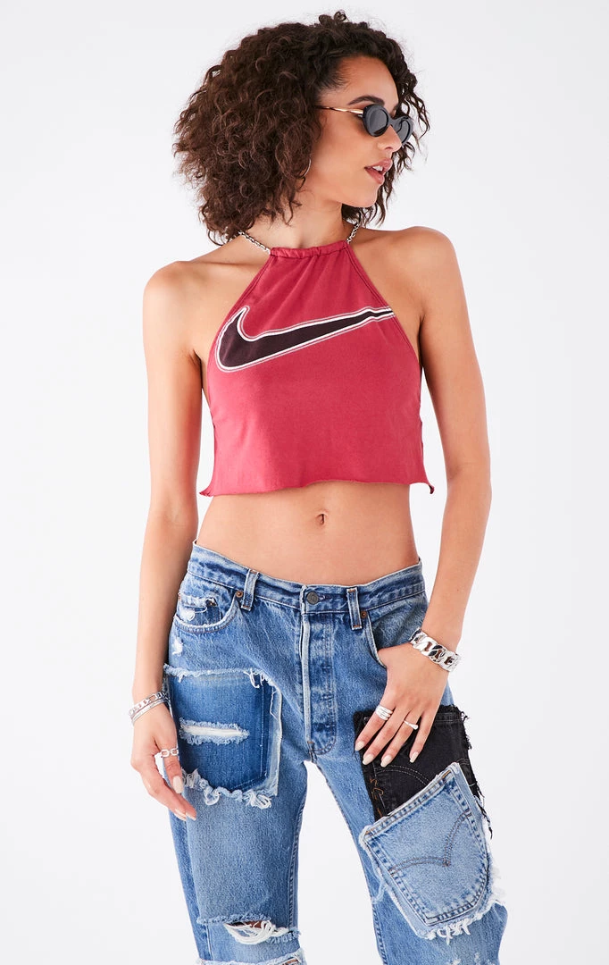 This vintage Nike tee was upcycled by Furst of a Kind. Reworked in Los Angeles with halter neck, waterfall chain back detail and crop cut.