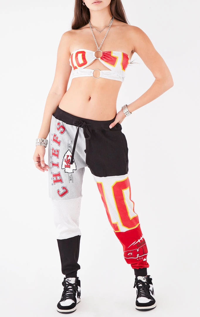 This vintage Kansas City Chiefs jersey was reworked with a whole new shape. Features a flattering cut out, cropped length, chain halter and finished off with double o-rings.Â
