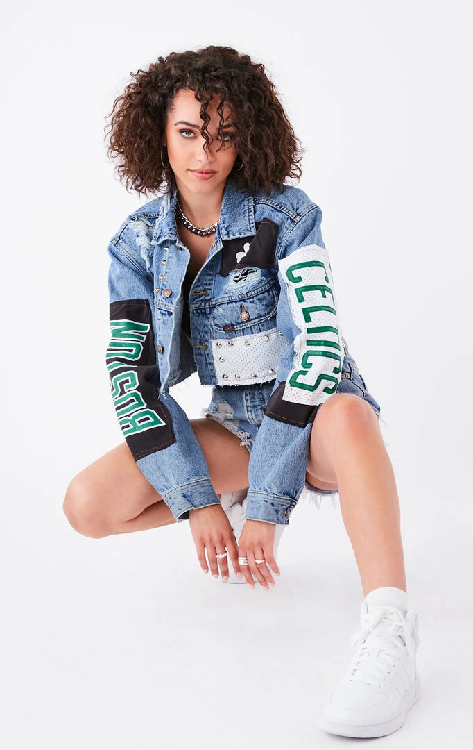 This reworked denim jacket was upcycled by Furst of a Kind. Crafted from the perfect oversized vintage Levi’s denim jacket body and patches from a vintage Boston Celtics tee and jersey. Finished off with studding and a cropped hem. Hand sourced and sewn in Los Angeles.