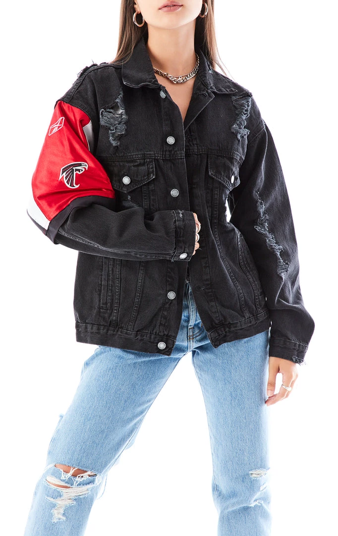 Hate to see you go, but love to watch you leave. It’s all about the back detail on this one of a kind repurposed denim jacket. Furst of a Kind added a vintage Atlanta Falcons jersey insert across the back and layered it over the sleeve. We are officially obsessed.