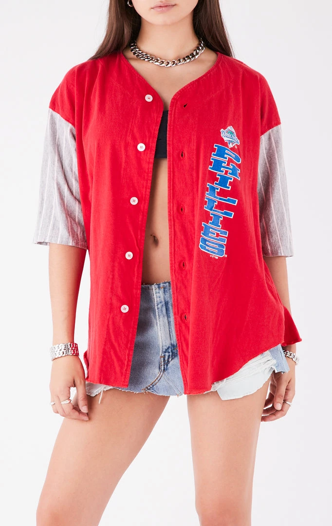 Style this vintage Philadelphia Phillies baseball jersey open or closed. Hand sourced for the perfect fit & fabric, then hard washed in Los Angeles by Furst of a Kind.