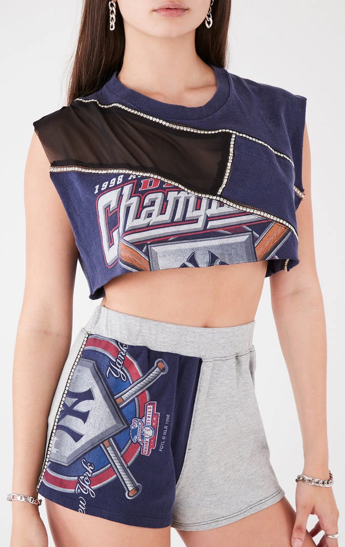 This one-of-a-kind mixed media sleeveless top and short set was crafted by Furst of a Kind from a vintage New York Yankees tee. Spliced together with another vintage t-shirt, sheer black mesh panels and finished with rhinestone trim.