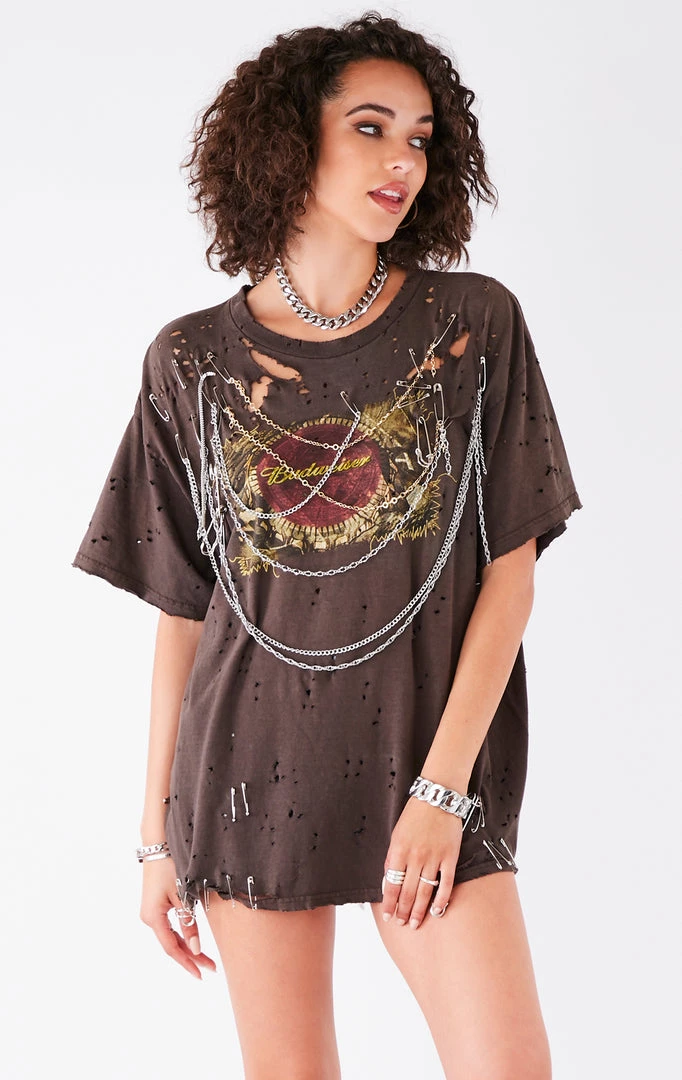 This one-a-kind vintage Budweiser tee was reworked by Furst of a Kind. Features a ripped and stonewash technique, multi draped chains and safety pin detail.