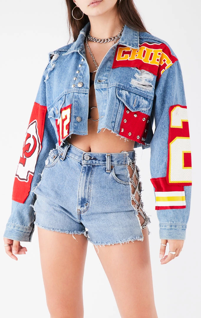 This reworked denim jacket was upcycled by Furst of a Kind. Crafted from the perfect oversized vintage Levi’s denim jacket body and patches from a vintage Kansas City Chiefs tee and jersey. Finished off with studding and a cropped hem. Hand sourced and sewn in Los Angeles.