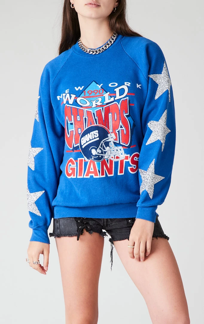 Upcycled from a vintage New York Giants sweatshirt Furst of a Kind reworked this NFL sweatshirt with silver star patch embellishment down both sleeves.