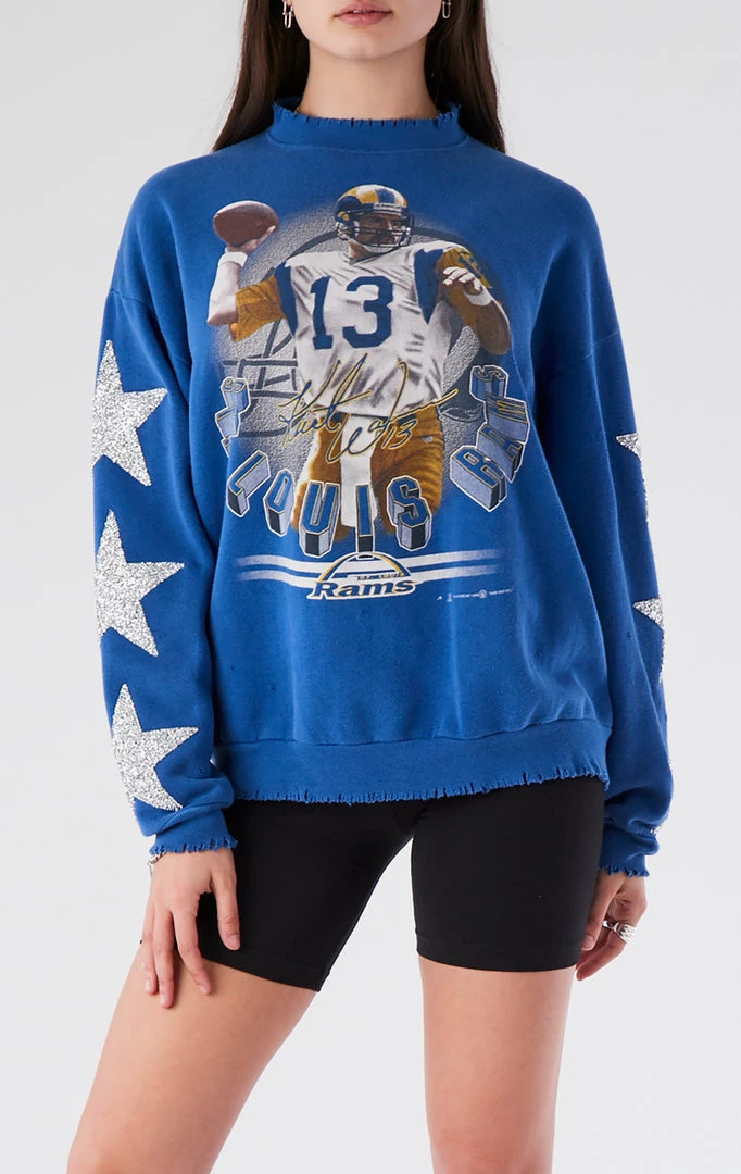 This Furst of a Kind reworked vintage St. Louis Rams sweatshirt is what dreams are made of. Silver rhinestone star patches adorn the sleeves or this handpicked vintage crewneck NFL sweatshirt.